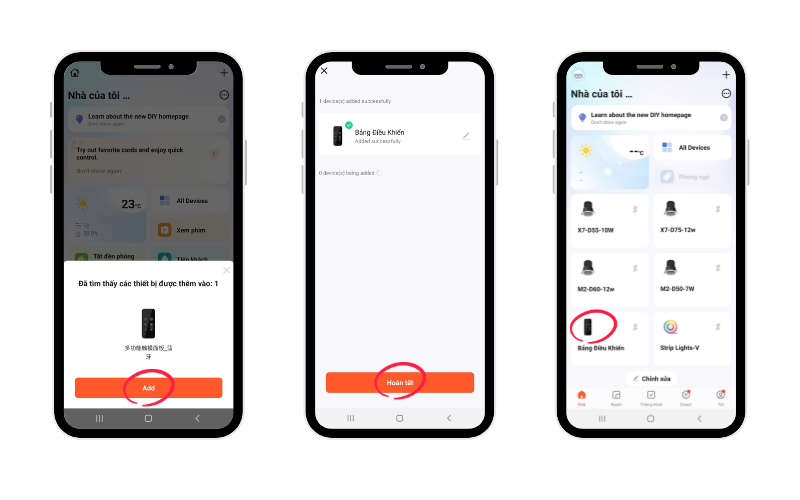 Trên màn hình xuất hiện thiết bị: Ấn ” ADD ” và ấn ” Hoàn Tất ” >> Bảng điều khiển sẽ xuất hiện ở trên màn hình chính.